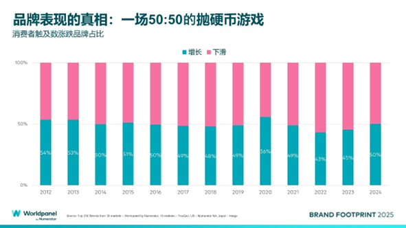 El índice de consumidores Worldpanel, basado en datos de compras de consumidores globales de 13 años, muestra que, entre las 250 marcas principales, la proporción de crecimiento de las marcas se mantiene estable entre el 45 % y el 55 %. En 2024, el 50,2 % de las marcas lograron un crecimiento, lo que concuerda con esta tendencia.