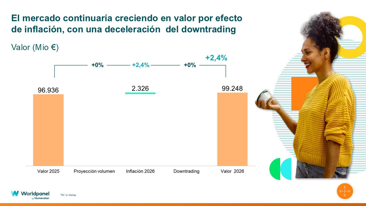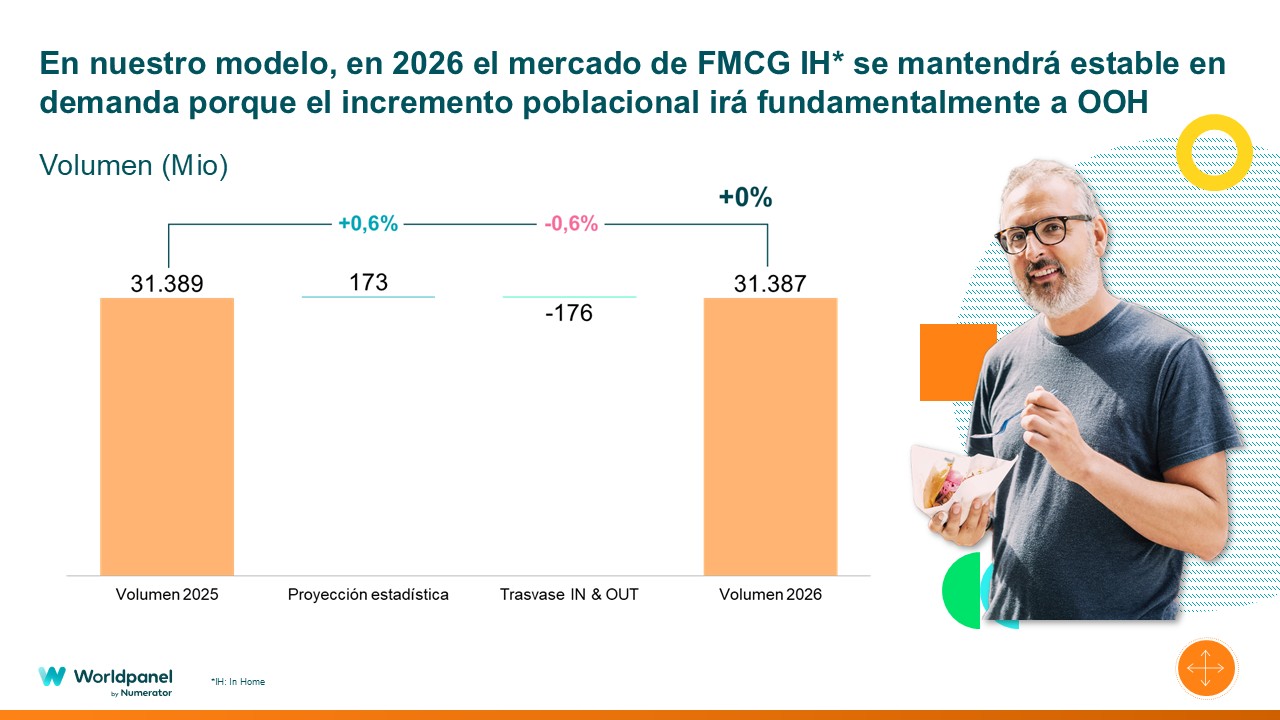 La estabilidad reina en el mercado de gran consumo una vez visto lo sucedido en 2025 y las previsiones para 2026. Un vistazo hacia atrás nos muestra un leve crecimiento en volumen el año pasado, que se repetirá este año, pero que se espera que mayoritariamente se vaya al consumo fuera del hogar. La inflación hará crecer los mercados mientras el consumidor va aceptando la nueva situación de precios, según Worldpanel by Numerator.